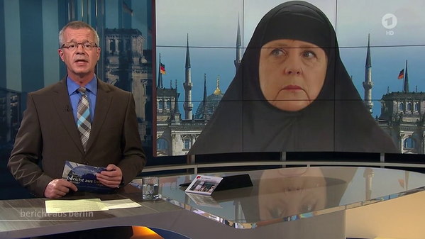 Ангела Меркель в хиджабе / кадр из теленовостей По большому счету, последствия этих инцидентов для Меркель будут зависеть от того, какие она предпримет ответные меры. Автор подчеркивает, что эти случаи насилия – далеко не единственная проблема, с которой сейчас столкнулась Меркель. Из последних событий это также, как минимум, продолжающийся миграционный кризис, решение Британии выйти из ЕС и банковские невзгоды в Италии.