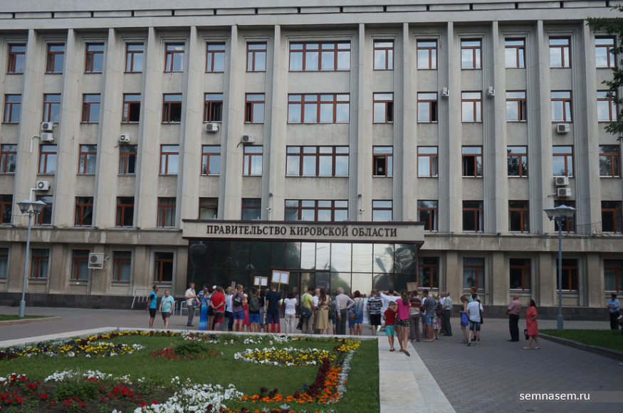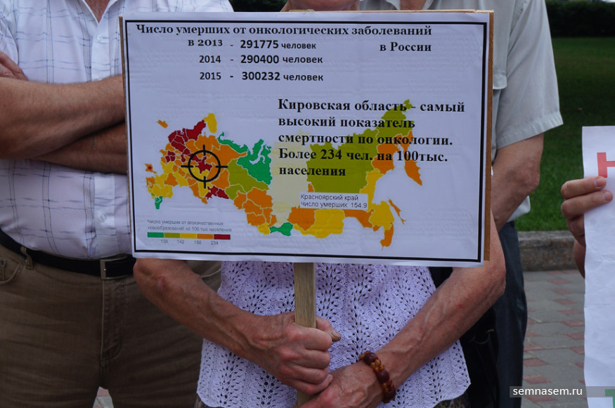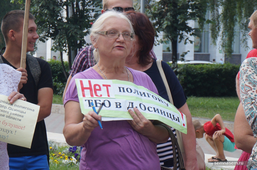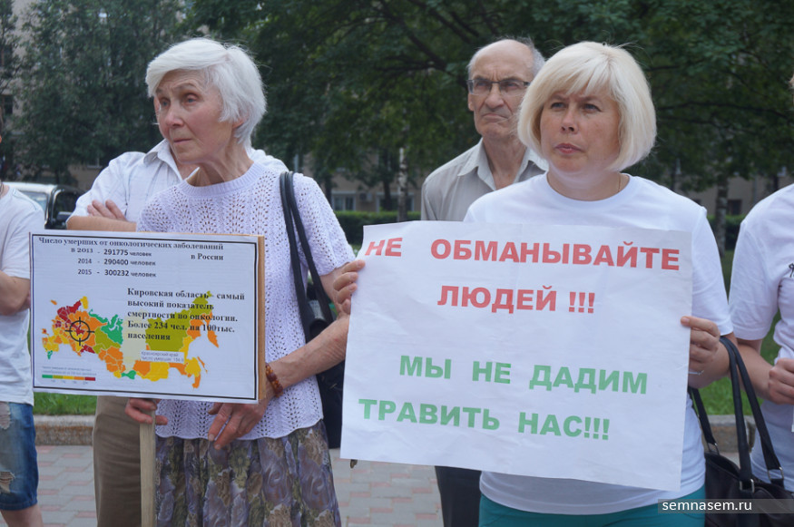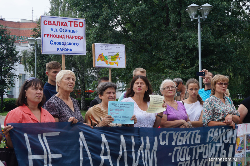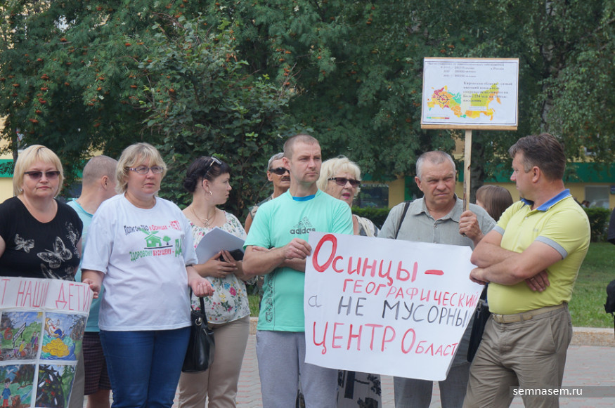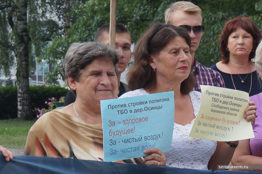 К часу дня к зданию правительства пришло около 50 человек, в основном — активисты инициативной группы против строительства полигона, жители Слободского района. Почти у каждого в руках был плакат с протестными лозунгами: «Не обманывайте людей! Мы не дадим травить нас», «Осинцы — географический, а не мусорный центр области», «Свалка ТБО — геноцид народа Слободского района». Пожилые люди держали в руках таблички, на которых было указано, сколько в России и Кировской области умирает людей от онкологии. Некоторые пришли в белых футболках, на них простая фраза: «Полигону ТБО — нет, здоровому будущему — да!».
