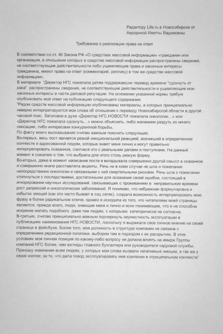 Позже на странице Ивы Аврониной в Facebook появилось письмо, адресованное СМИ Новосибирской области, в частности порталу Life.ru: