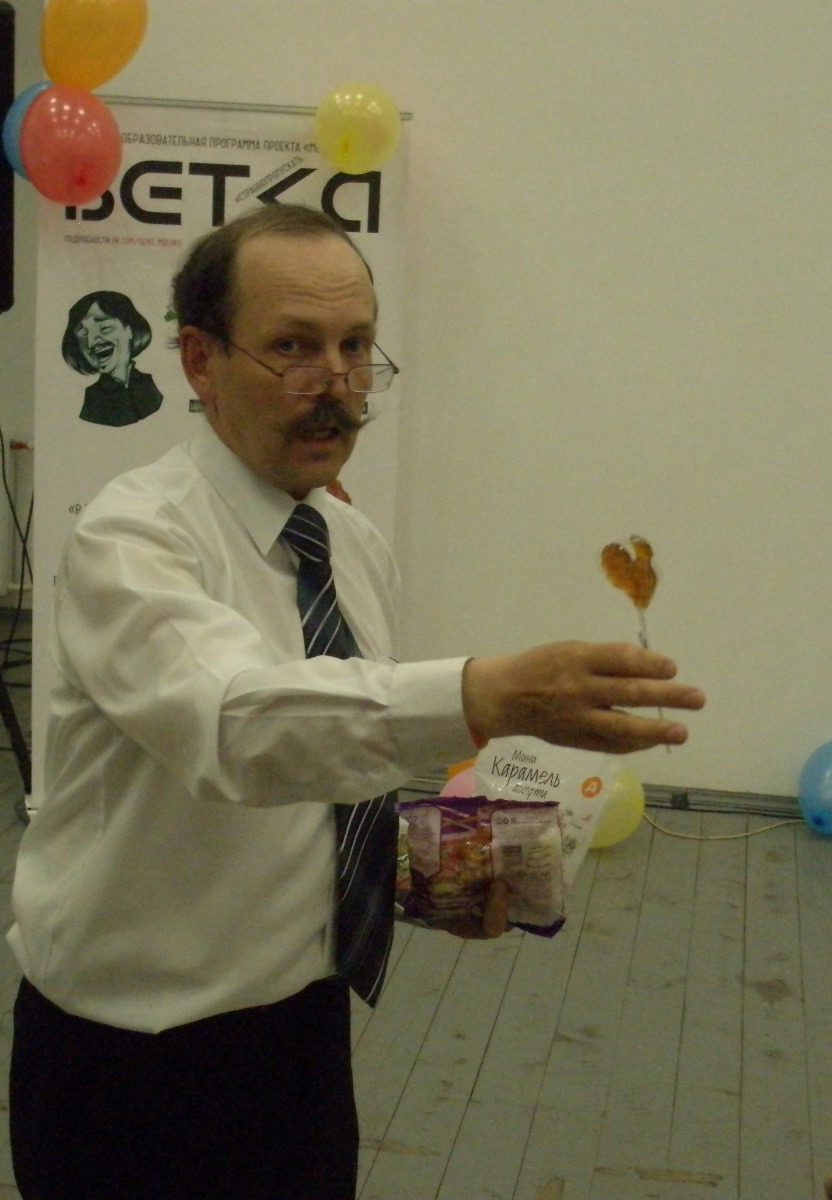 В Пскове Виктор Лукьянов увидел опоздавших зрителей — и сразу же со словами «Штрафная — чтобы не опаздывать!» устремился к ним выдавать дежурные конфеты. Попутно бросил взгляд на меня и прокомментировал: «Для затравки. А ведь скажут, что прикормил… Корреспондент уже пишет…»