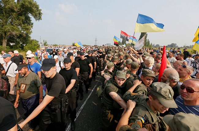 Фото: Валентин Огиренко / reuters / Scanpix / LETA Участники восточной колонны крестного хода проходят мимо активистов ОУН в Борисполе. 25 июля 2016 года