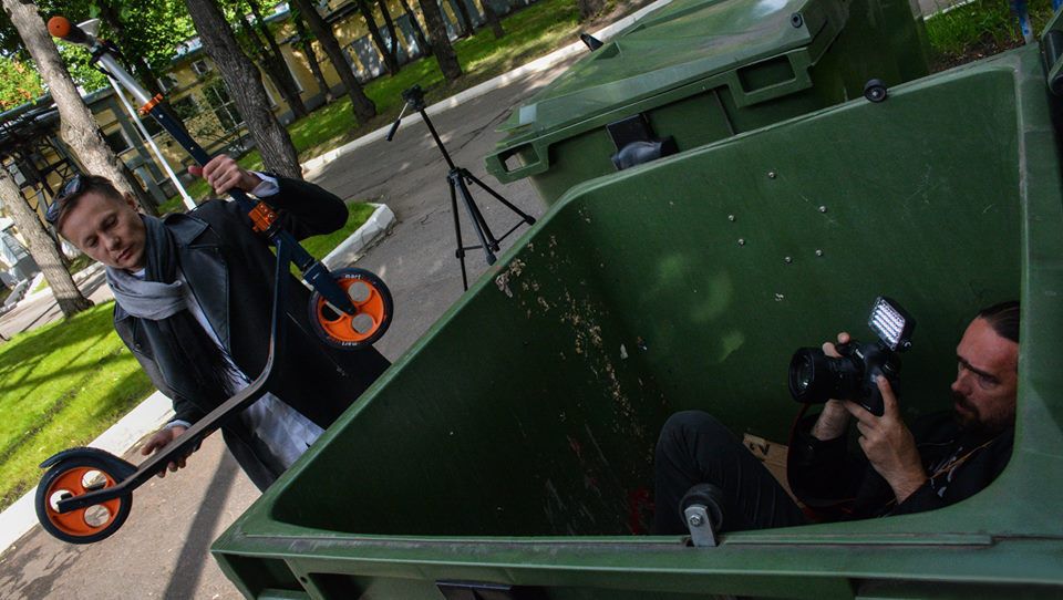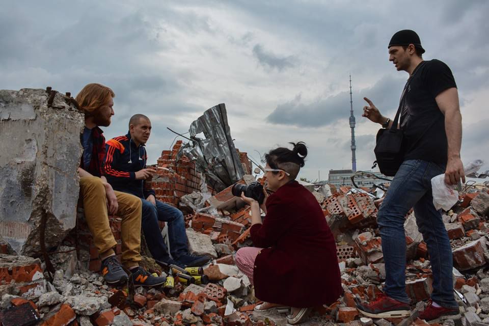 На солнышке блестит колючая проволока, небо перекрывает мощная бетонная стена. Мимо меня со свистом пролетают машины. Где найти этих киношников? Маленькими группками они должны были снимать на ВДНХ, а я, обойдя весь парк и выйдя к Ботаническому саду, видела только туристов с камерами и ни одного «человека с киноаппаратом». И теперь, огибая стену построенного в советское время завода «Калибр», хочу добраться до штаб-квартиры «Кинолаба». Когда монотонная полоса стены заканчивается, начинается лабиринт строений. В окнах шелестят жалюзи, вокруг меня изредка мелькают люди в белых рубашках и рабочие в оранжевых касках. За зданиями офисов лежат груды камней — развалины завода. На стоянке возле джипа стоит мужчина в чёрной косухе и солнцезащитных очках, он поигрывает пистолетом. Надеюсь, это «Кинолаб».— А вы снимаете? Я журналист, я посмотрю, хорошо?