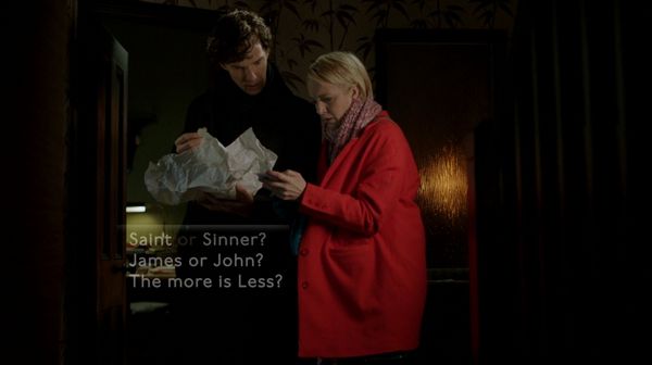 2 Когда Шерлок посыпается первый раз и обнаруживает себя на борту самолета, мы выясняем, что перед тем, как заснуть, он читал блог Джона. На это ему указывает Мэри; Шерлок отвечает ей: «Для меня полезно смотреть на себя глазами Джона», и тут же иронически как бы аннулирует первую часть высказывания второй: «… потому что в его глазах я выгляжу гораздо умнее». Но нас это не должно вводить в заблуждение: Шерлоку действительно необходимо видеть себя глазами Джона, который, разумеется, насчет его позерства нисколько не обманывается и видит в Шерлоке нечто такое, что сам Шерлок разглядеть не в состоянии.