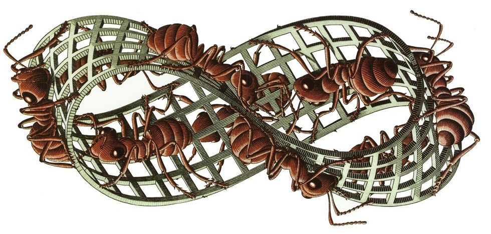 Мы, как муравьи, ползущие по ленте Мёбиуса, все время ощущаем, что существует другая, недоступная сторона ленты, что существует потустороннее. Хотя никакой другой недоступной реальности нет, хотя сторона у ленты Мёбиуса всего одна — и мы об этом знаем. Так устроена пресловутая «саморазорванность земной основы», о которой писал Маркс: не как разорванность внутреннего и внешнего, а как разорванность между глобальной, видимой извне односторонностью и локальной, видимой изнутри двусторонностью ленты Мёбиуса. Еще раз: Бога нет, но Бог есть; Бог бессознателен.