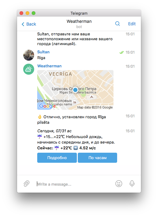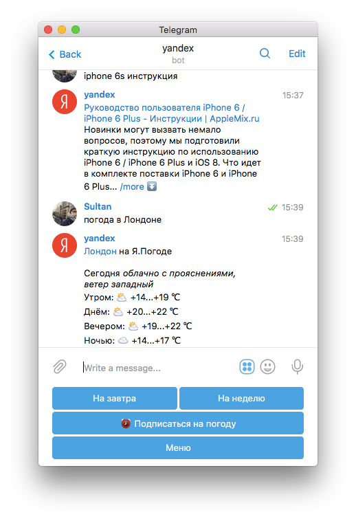Один из самых полезных ботов: сообщает погоду прямо в Telegram.