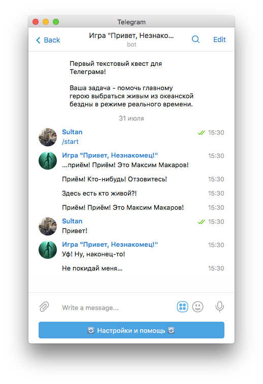 Текстовый мобильный квест — вы переписываетесь с героем, который оказался в непростой ситуации. Есть и вторая часть квеста — «Привет, незнакомец! 2».