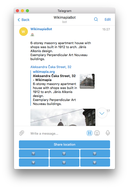Бот, подключенный к картографическому сервису Wikimapia. Присылает информацию о ближайших объектах. Лайфхак: можно отправлять не свое местоположение, а любую точку на карте через стандартную кнопку Telegram,