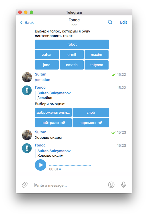 Бот синтезирует аудиозапись, в которой робот произносит вашу фразу. Можно выбрать разные интонации и голоса.