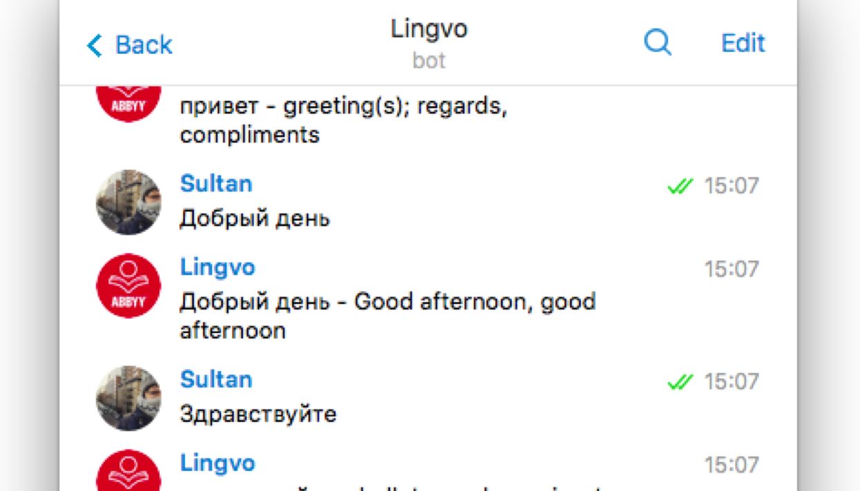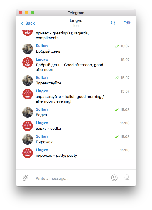 Бот, использующий словари ABBYY Lingvo. Переводит только отдельные слова и только с русского на английский и обратно.