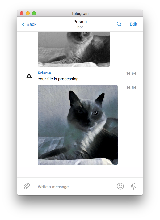 Бот российского сервиса, превращающего фотографии в картины с помощью нейросетей. Умеет то же самое, что и приложение, только через мессенджер.