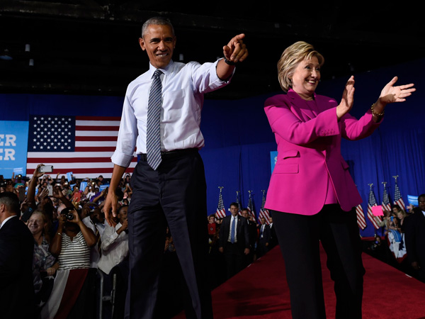 Барак Обама и Хиллари Клинтон Собственно, даже главный лозунг, под которым выступает Трамп («Вернуть Америке величие»), отсылает к президентской кампании Рональда Рейгана в 1980-е гг. Это, в свою очередь, отсылает к ностальгии по тем временам, которую испытывают нынешние республиканцы. Клинтон, в свою очередь, выступает в имидже вестницы перемен, что отсылает к лозунгу Билла Клинтона, который в 1992 г. утверждал, что «пора изменить Америку». Здесь тонкий момент, потому что демократы относятся к эпохе правления Билла Клинтона гораздо более неоднозначно, чем республиканцы – к правлению Рейгана. Поэтому Клинтон также делает ставку на то, чтобы хвалить достижения нынешнего президента США Барака Обамы.
