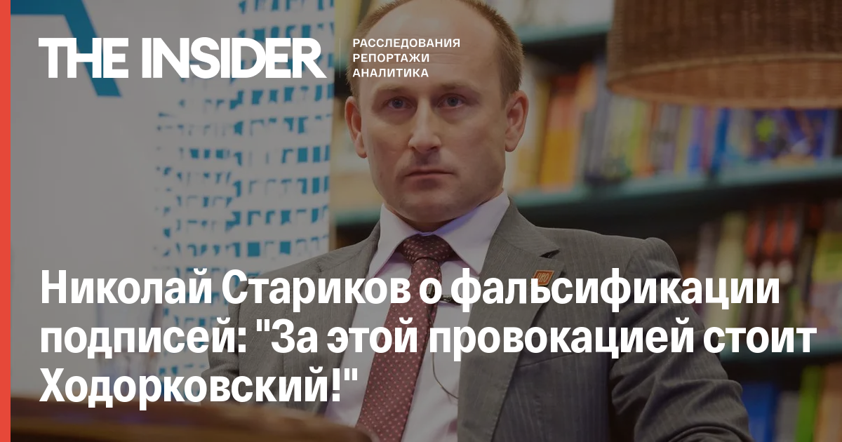 Кандидат в депутаты Мособлдумы от «Партии Великое Отечество» Николай Стариков, известный своими популярными книгами в жанре теорий заговора, прокомментировал The Insider информацию о фальсификации подписей, обнаруженной «сотрудниками «Открытой России«. Хотя в самой «Открытой России« (по неизвестным The Insider причинам) эту информацию сочли провокацией, Стариков убежден, что за всем этим стоит Ходорковский: »Для нас очевидно, что, если организация, которой руководит один из злейших врагов России - Михаил Ходорковский, выбирает нас в качестве мишени, то это значит, что мы делаем что-то правильное для нашей страны. Для нас - это знак, что мы движемся в правильном направлении", - заявил он.