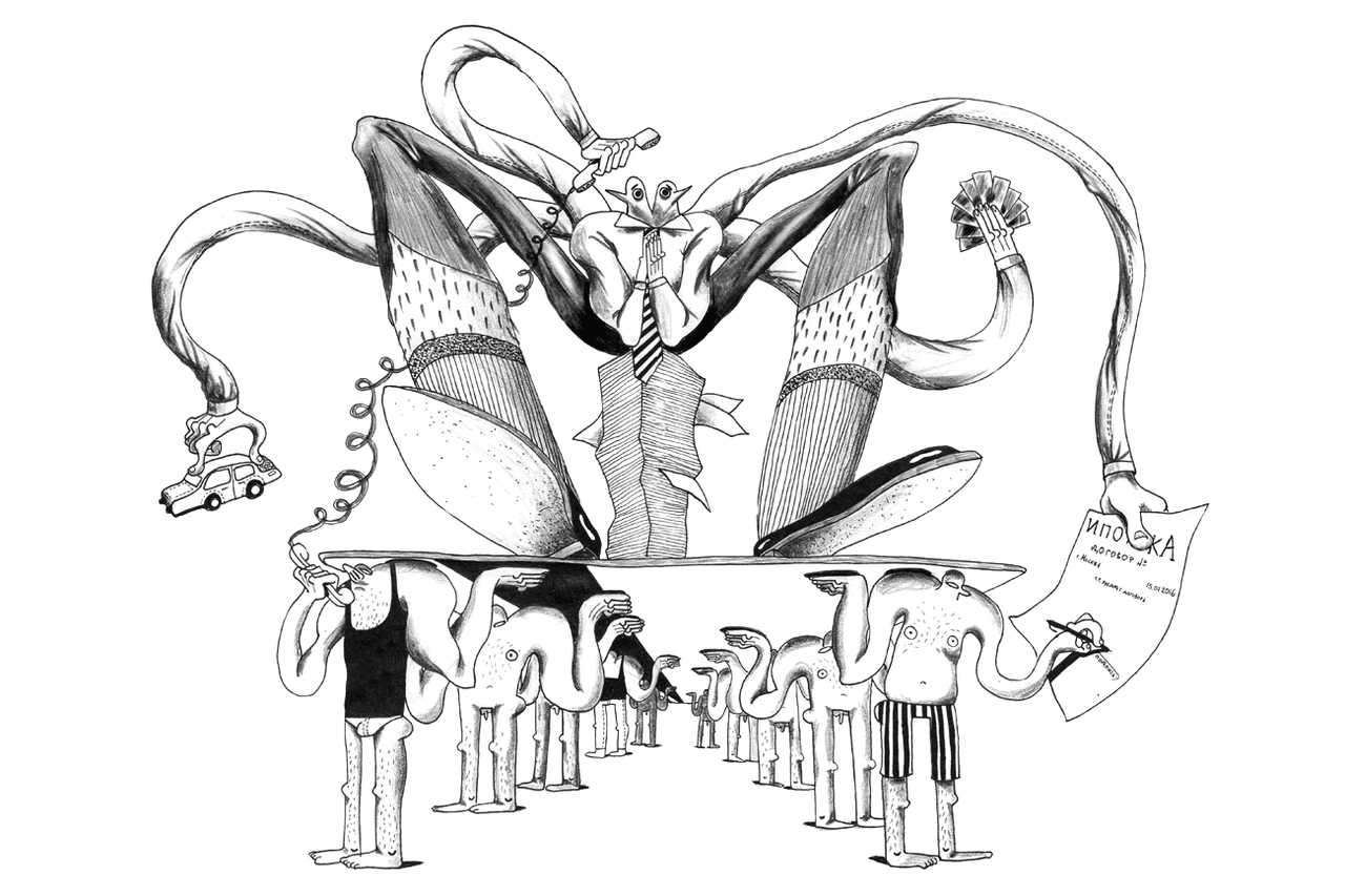 «Закрыл кредитку наконец-то, сходил в храм и поставил свечу иконе пресвятого Николая». Пока ты скормняга-дебетяга, банковские демоны в какой-то момент всё же поймут (движения средств-то видно), что тебя можно потрясти, и тебе будут навязывать кредиты в любом очном и заочном виде: слать смс и мейлы, а также постоянно названивать. Или попытаются хитренько вместе с дебетовой картой выпустить и кредитку: «Тут галочку, тут галочку, хоп-хоп». Ловкость рук и никакого мошенничества. Банковские работники же хотят, как лучше! Чтобы у тебя была хотя бы карточка, хотя бы на кредитных 100 000, хотя бы рублей. Ты ведь можешь и не пользоваться ею.Действительно серьёзные вещи — это кредит на квартиру или даже машину. Тут у банка тоже много мелких способов, как с тебя снять последние штаны. Например, не каждый знает, что, пока ты выплачиваешь кредит за свои квадратные метры, именно через банк нужно брать справку-запрос о возможности регистрации в своей же квартире. Каждый год нужна новая. Она ещё и стоит две тысячи рублей. Мелочь, на первый взгляд. А если ипотека у тебя на пятнадцать лет, то это плюс тридцать штук банку и минус тридцать штук из твоего и так вечно пустого (ипотека же!) кармана. И это не считая выплаты по процентам и многочисленных страховок.