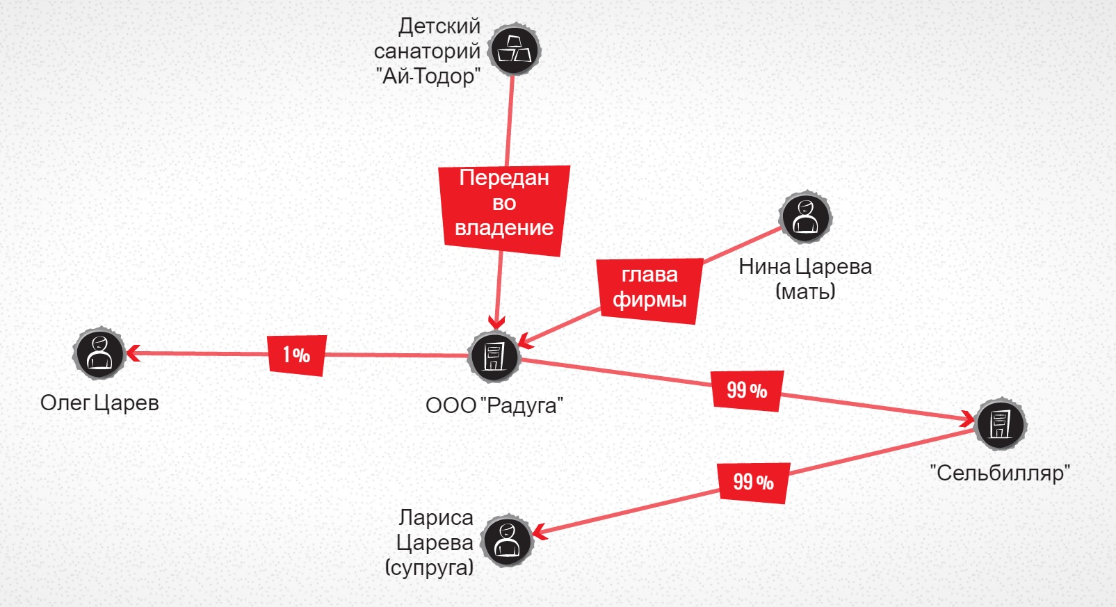 Сейчас в здании – памятнике архитектуры расположен детский санаторий "Ай Тодор". В ноябре 2015 года Минэкономразвития Крыма поручило его реконструкцию компании "Радуга", которую возглавляет мать Царева, а учредителями являются сам Олег Царев и компания "Сельбилляр", принадлежащая его супруге, передает телеканал.