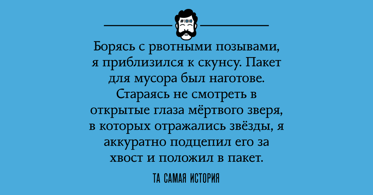 Скунса я почуял, как и в прошлый раз, сильно заранее. Борясь с рвотными позывами, я приблизился к нему. Пакет для мусора был наготове. Стараясь не смотреть в открытые глаза мёртвого зверя, в которых отражались звёзды, я аккуратно подцепил его за хвост и положил в пакет.