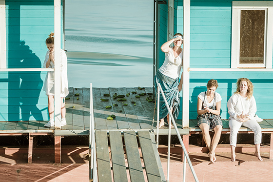 Пока одна часть зрителей рыскала по острову в поисках неуловимых волкостреловских гидов, другая жарилась на склоне у воды в ожидании премьеры эскиза «Свияжское время». На уютном дебаркадере, точно с картины Эдварда Хоппера, пьесу Павла Полякова воплощала казанская независимая команда «Пакет-театр» под предводительством Регины Саттаровой. Пять девушек поочередно появляются перед публикой, чтобы либо произнести несколько перебитых радикальными паузами фраз, либо просто помолчать. Слова все здешние — опять-таки про драги, про святого Христофора, про «мутную историю». Паузы тем более стопроцентно свияжские: то вертолет пролетит, то голубиная стая, то катер промчится — ощущение, будто смотришь какое-нибудь авторское скандинавское кино, где истории будто бы и нет вовсе, зато есть атмосфера статичного апокалипсиса при эстетике безупречной нормативности. Свияжское время обнаруживается где-то между зацикленных фраз об одном и том же, в перерывах между отмахиваниями от комаров, в ритуальных междометиях. И главное — в самом спектакле, фактическая продолжительность которого категорически не совпадает с ощущаемой.