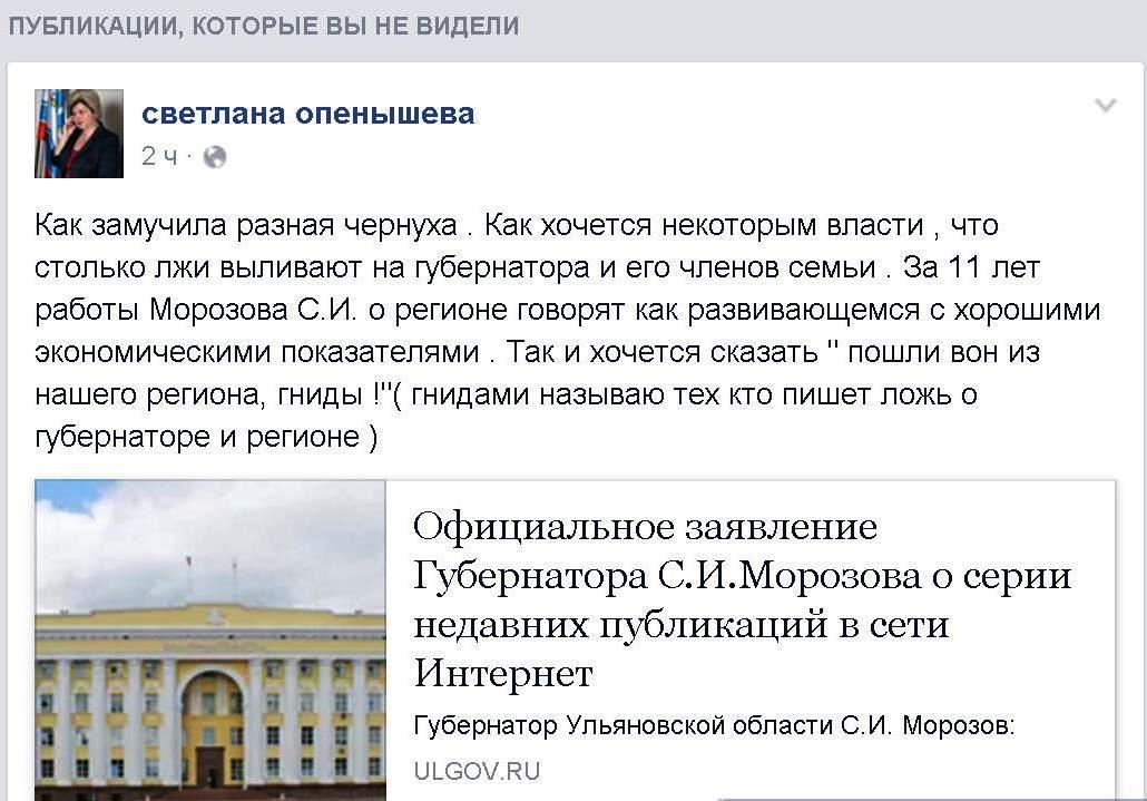 Реакция Морозова на публикацию этого письма в интернете была весьма нервной. Он выступил с официальным заявлением: "Распространяются слухи, которые буквально убивают мою мать, моих детей, младшие из которых только пошли в школу. Президент Владимир Путин сказал однажды: не надо со своим сопливым носом лезть в мою семью". "Так и хочется сказать: "Пошли вон из нашего региона, гниды!" – через "Фейсбук" обратилась к критикам Морозова его тогдашний заместитель Светлана Опенышева.