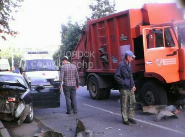 В Красноярске пьяный водитель без прав выехал на встречную полосу и врезался в мусоровоз.