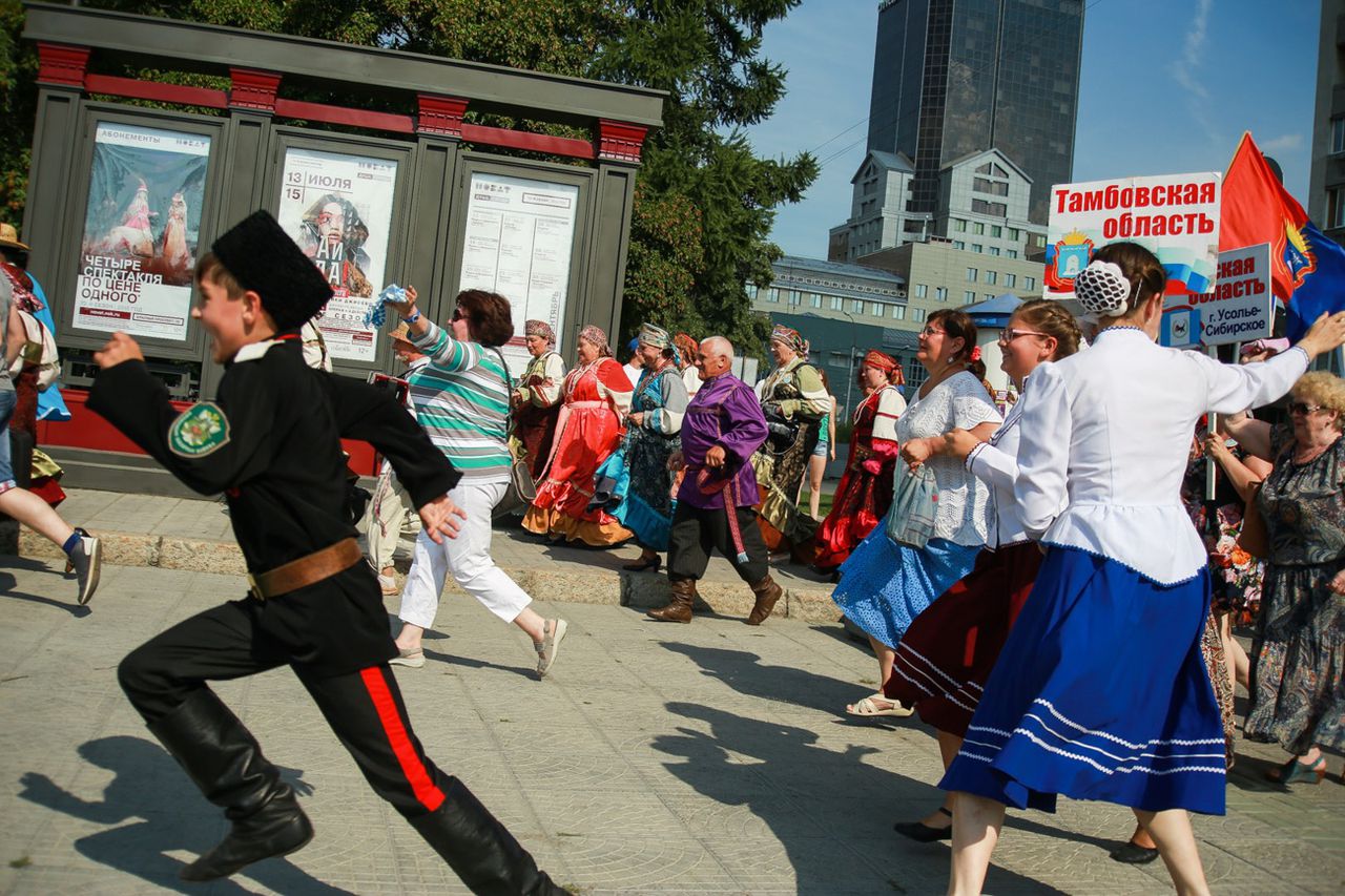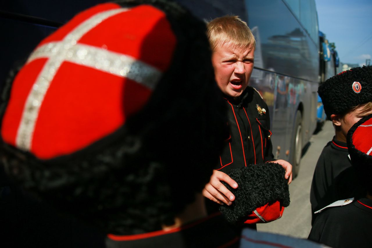 Из хвоста колонны выбегают несколько разодетых в русские народные костюмы девчонок и мальчишек и кадеты Бердского казачьего корпуса. Их сопровождает взрослый мужчина — что-то среднее между атаманом и священником, на нём чёрная папаха, длинная ряса, а в руках хоругвь со Спасом Вседержителем.