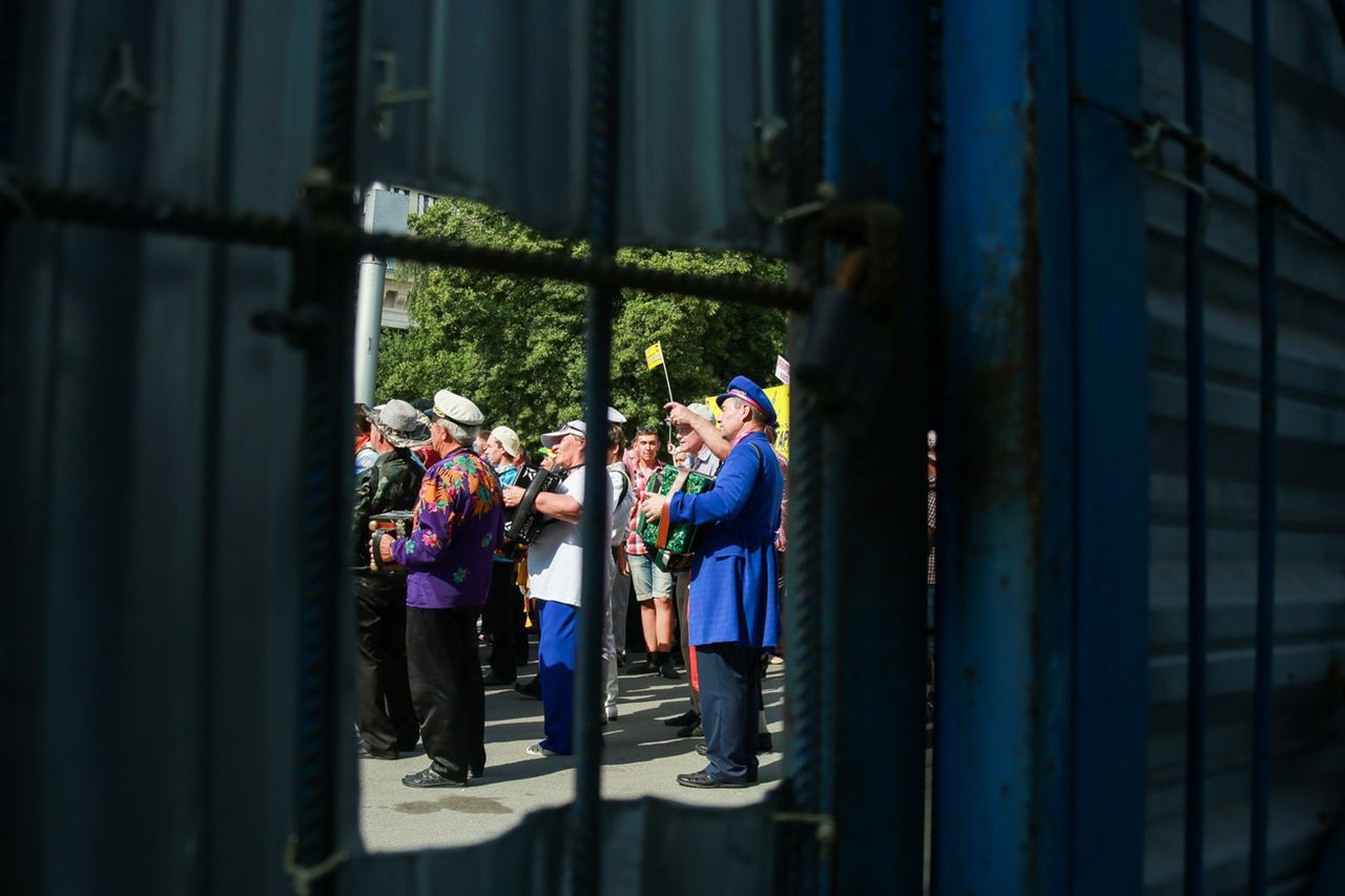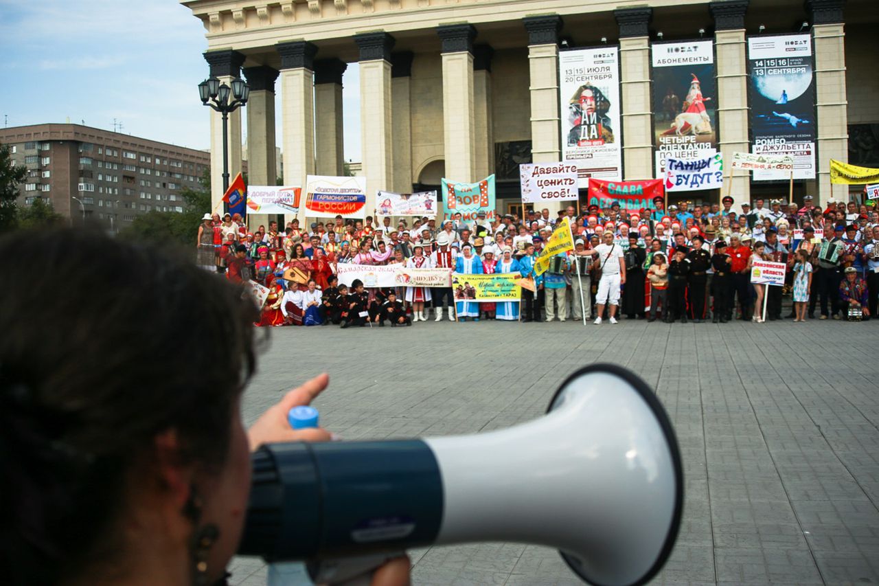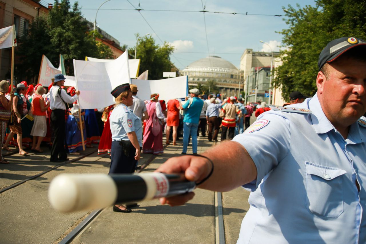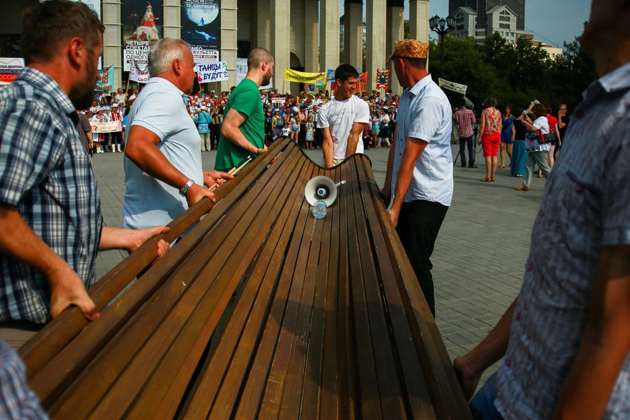 Гармошки с бубенцами, аккордеоны, инкрустированные уральскими самоцветами, молодецкие выкрики и девичьи визги — всё замолкает. Во главе огромной разноцветной колонны стоят несколько пожилых мужчин. Они предельно напряжены, их глаза ловят каждое движение командира, чтобы не упустить момент, когда они должны будут повести толпу на неравный бой с телезрителем.