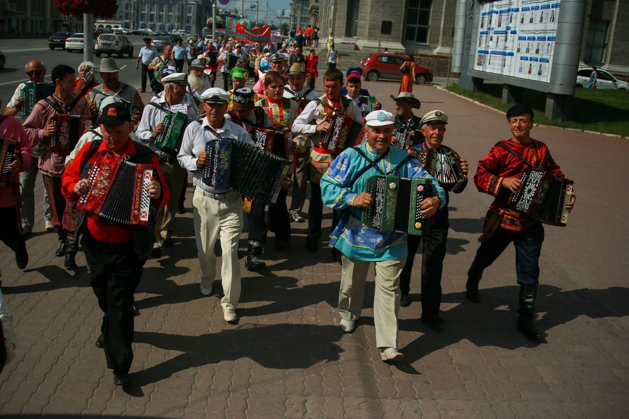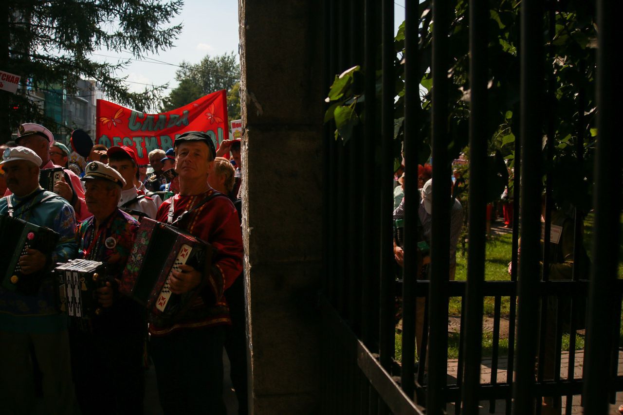 Колонна останавливается на перекрёстке. Сквозь небольшой сквер к ней спешат Захар и Анастасия Заволокины. На ней чёрный балахон, он тащит флаг фестиваля на белом пластиковом древке. Дети «первого гармониста России» Геннадия Заволокина после неожиданной смерти отца в 2001 году не бросили его дело — Анастасия стала художественным руководителем ансамбля «Частушка» и вместе с братом ведёт основанную Геннадием телепередачу «Играй, гармонь!». Мало кто откажется заработать денег на имени умершего знаменитого родственника, тем более что отец сам решил судьбу Анастасии и Захара — с раннего детства они играли в его коллективе.
