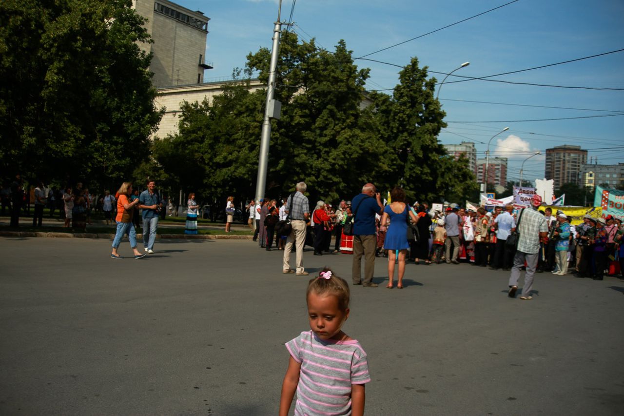 К голове колонны подходит пожилая пара с внучкой. Бабушка пытается сфотографировать девочку радостную на фоне шествия, но на лице ребёнка всё ярче проступают грусть и обида. Дедушка внимательно смотрит на праздничную колонну.