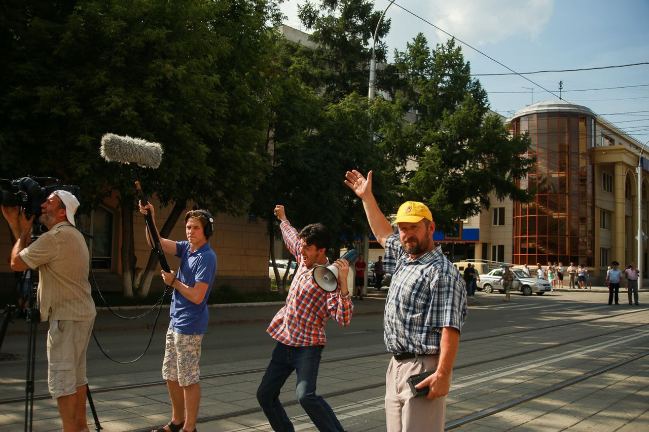 — Транспарант нормально растяните! — кричит в мегафон режиссёр в кепке с надписью «Справедливая Россия». — Тихо!