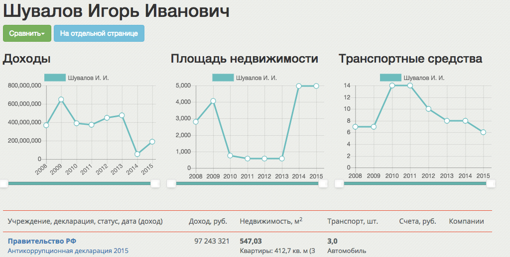 Организация «Трансперенси Интернешнл-Р» сделала обновление своего справочного сервиса с данными о доходах чиновников «Декларатор». Теперь пользователи могут просматривать данные из деклараций публичных должностных лиц в виде линейных графиков.