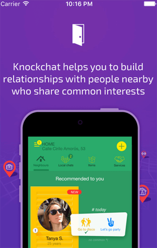 Для того чтобы поближе познакомиться с соседями, скачайте приложение на мобильный телефон в iTunes или Google Play. После регистрации добавьте в профиль свой домашний адрес, и вы увидите, кто из соседей уже участвует в тематических чатах. KnockChat поможет обсудить любую локальную тему между соседями. Вы можете присоединиться к уже существующему чату или создать свой.