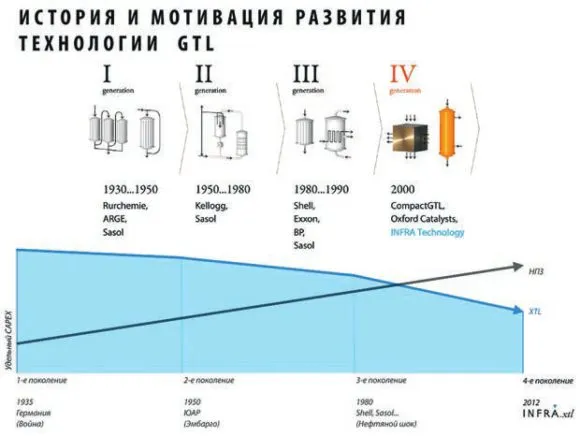 Процесс GTL (Gas-to-liquids — газ в жидкость) существует в современной промышленности в виде предприятий, на которых реализована технология третьего поколения. Она разработана крупными нефтяными компаниями после арабского нефтяного кризиса (рис. 1). В Катаре и Малайзии есть три завода третьего поколения, созданные англо-голландской Shell и южноафриканской Sasol. Несколько американских компаний сделали похожие разработки, но дальше опытного производства у них не пошло — технология третьего поколения уже очень хороша, но она дороже, чем нефтепереработка. В Катаре сейчас два самых новых, самых больших завода. Катар имеет практически один ресурс — природный газ, и эти предприятия — способ диверсифицировать экспорт. Это себя оправдывает в экономико-политическом ключе. То же с Южной Африкой, которая долго была под эмбарго. «Эти заводы работают, выходя за рамки обычной экономики», — поясняет Владимир Мордкович.