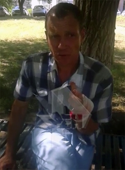 Человек в клетчатой рубашке сидит на скамейке под деревом, подняв перед собой замотанную окровавленным бинтом руку. В руке он сжимает свой отрубленный левый мизинец. «Вот это вынудило меня сделать следствие города Магнитогорска по факту изнасилования моей жены сотрудниками полиции», — говорит человек на камеру.