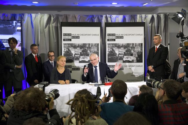 В конференц-зал Музея Берлинской стены в этот зимний день набились журналисты более чем из 80 изданий, и ведущей приходилось их перекрикивать. «У нас уже были в гостях Андрей Сахаров, Лев Копелев, Мстислав Ростропович, и вот теперь у нас в гостях — Михаил Ходорковский! — надрывалась директор музея. — Мы хотим сказать большое спасибо Министерству иностранных дел Республики Германия и президенту России Владимиру Путину». Стало совсем шумно; послышался смех и свист. Ведущая тоже рассмеялась и закрепила свою благодарность: «Да-да, Ходорковский находится рядом с нами благодаря Владимиру Путину».