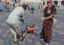 Акция состоялась в четверг. Мокренок с Виктором Капитоновым, игравшие роль семейной пары, тащили по брусчатке снятого с инвалидной коляски Дмиртия Жданова в церковь, чтобы "очистить от нечисти". Возле храма активистов задержали полицейские. Мокренок доставили в отдел полиции "Китай-город". Там ей предложили подписать некий документ, однако она его порвала. После этого активистку отпустили.