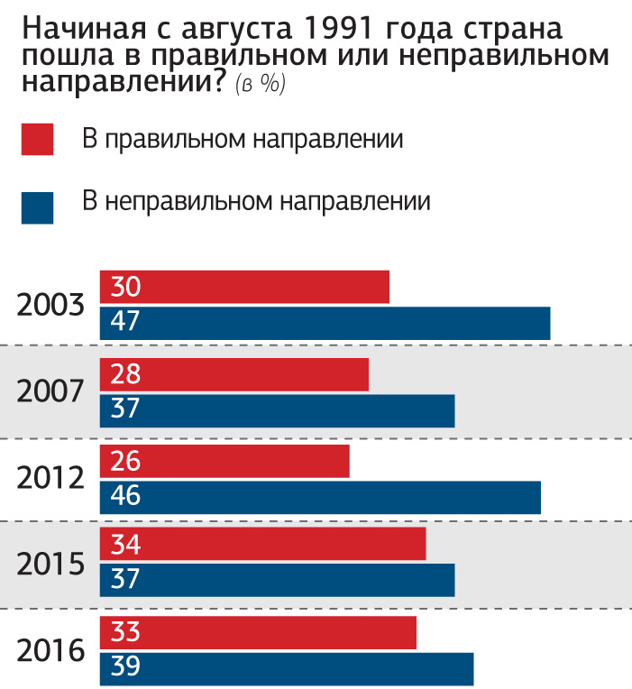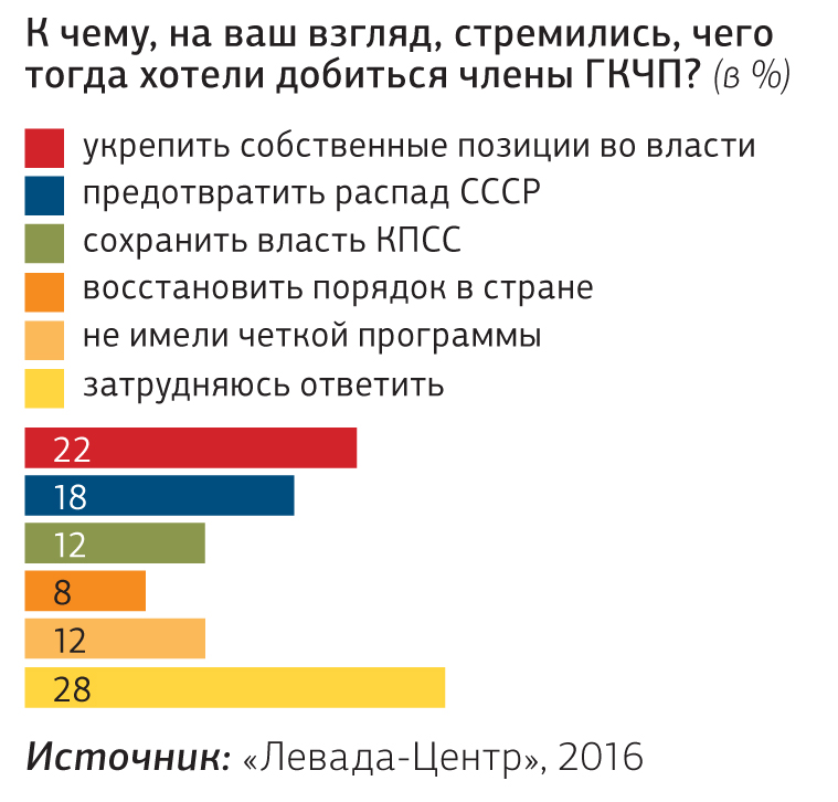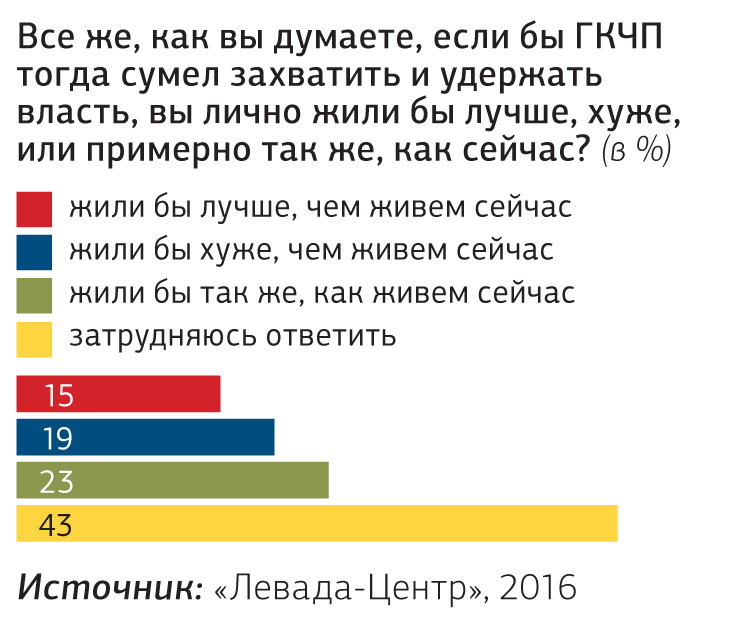 Логично, что результатом «трагедии с гибельными последствиями» значительное число россиян (47% в 2003 году, 39% в 2016-м) называет «неправильное направление развития страны». При этом около трети стабильно уверены, что страна все-таки развивается в правильном направлении 30% в 2003 году, 33% в 2016-м). В ответе на вопрос о том, кто был тогда прав, у «демократов» с ГКЧП почти ничья: в 2016 году 13% россиян отдали предпочтение Ельцину и 15% — путчистам. Впрочем, за все годы проведения опросов подавляющее большинство жителей страны так и не смогло определиться с ответом. При этом действия ГКЧП в 2016 году «скорее отрицательно» или «резко отрицательно» оценили в сумме 34% опрошенных, в то время как «скорее положительно» и «целиком положительно» — только 16%. Полнейший разнобой — и в ответах на вопрос о предполагаемых целях путчистов. Правда, здесь самый популярный из содержательных вариантов (если не считать традиционного «затрудняюсь ответить») — «укрепить собственные позиции во власти» (22% опрошенных в 2016 году). Ничего особенно хорошего россияне от любых начальников не ждут и действия их оценивают соответственно. Свидетельством тому — варианты ответов на вопрос «Лучше или хуже, чем живем сейчас, мы жили бы, если бы ГКЧП победил?»: в 2016 году 15% россиян ответили, что жили бы лучше, 19% — что жили бы хуже, а 23% уверены — что так же.
