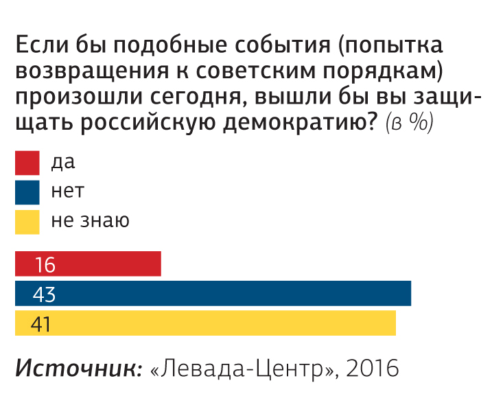 Но главное — демократия, права и свободы, то есть то, ради чего выходили на баррикады защитники Белого дома, понимая, что все — всерьез, а ставка в противостоянии — собственная жизнь, не стали ценностями для жителей России. Еще один эксклюзивный вопрос от The New Times в юбилейном опросе «Левада-Центра»: «Если бы подобные события (попытка возвращения к советским порядкам) произошли сегодня, вышли бы вы защищать российскую демократию?» «Да» — 16%, «нет» — 43%. Остальные ответить затруднились.