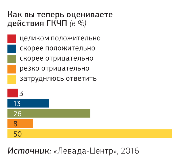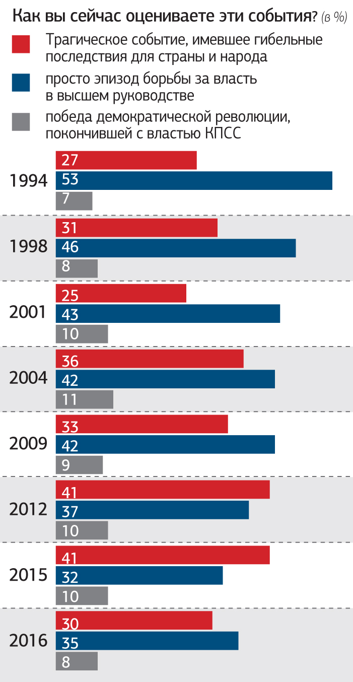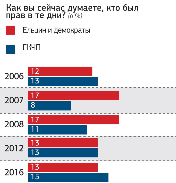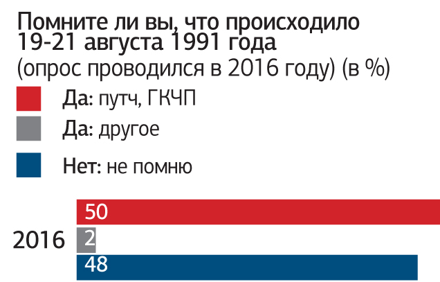 Специалисты из «Левада-Центра» отслеживают изменение отношения россиян к августовскому путчу с 1990-х годов прошлого века (строго говоря, с тех еще времен, когда Юрий Левада возглавлял ВЦИОМ, и позже — после создания сначала ВЦИОМ-А и затем «Левада-Центра»). В юбилейном 2016 году по просьбе редакции The New Times помимо стандартных вопросов в линейку было включено несколько эксклюзивных. И главный — прямой, в лоб: «Помните ли вы, что происходило 19–21 августа 1991 года»? Из 1602 россиян старше 18 лет, составлявших репрезентативную выборку, только 50% выбрало вариант «да: путч, ГКЧП». 2% помнят «другое», а 48% — не помнят ничего.