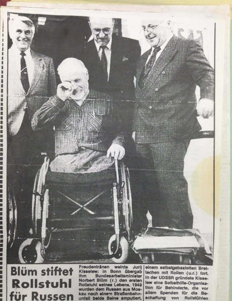 Бонн. Министр труда ФРГ Норберт Блюм (справа) и Юрий Киселев на своей первой в жизни инвалидной коляскеФото: из личного архива — Киселев создал эту ассоциацию в мае 1978 года, она просуществовала пять лет. В нее входило пять-шесть человек и еще редактор бюллетеня Елена Санникова.