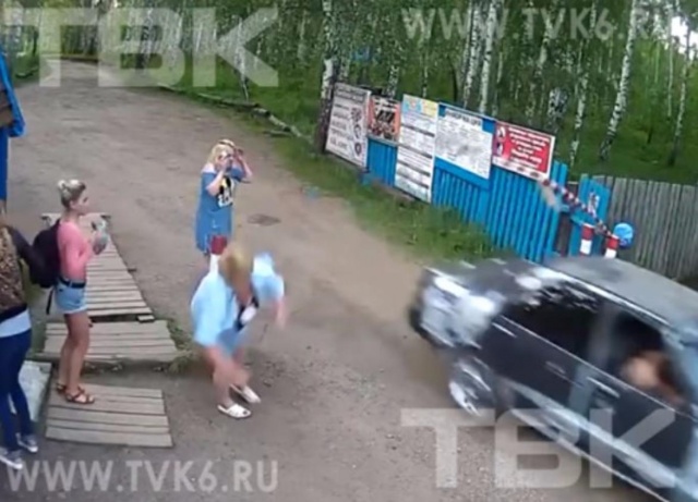 Женщину-администратора, которая не хотела пропускать агрессивных посетителей, ударило шлагбаумом. Водитель иномарки сбил шлагбаум, и железная труба отлетает прямо в администратора.