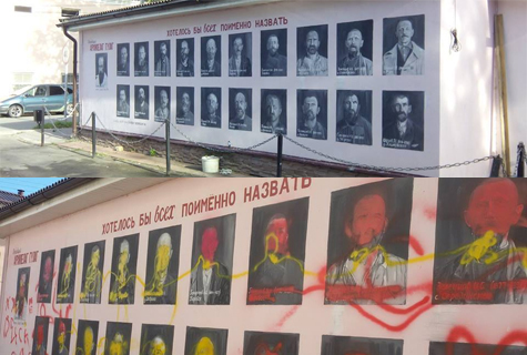 К утру 17 августа лица на портретах были заляпаны красной и желтой краской, их имена закрашены. На стену были нанесены нецензурные надписи. Никаких сведений о лицах, осквернивших мемориал, пока нет.