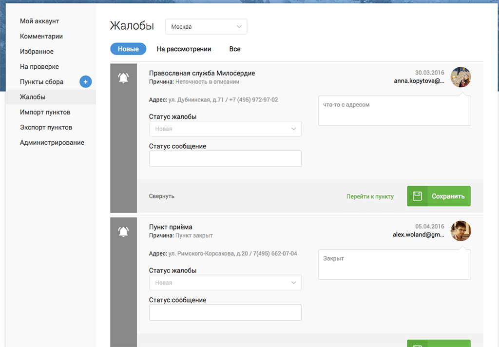 Сейчас карта раздельного сбора мусора Гринпис представлена в виде карты с подложкой Google Maps, где данные отображаются после проверки и премодерации. Каждый волонтер может взять на свой выбор несколько пунктов, отслеживать их работу и следить за количеством жалоб по отношению к взятым пунктам.