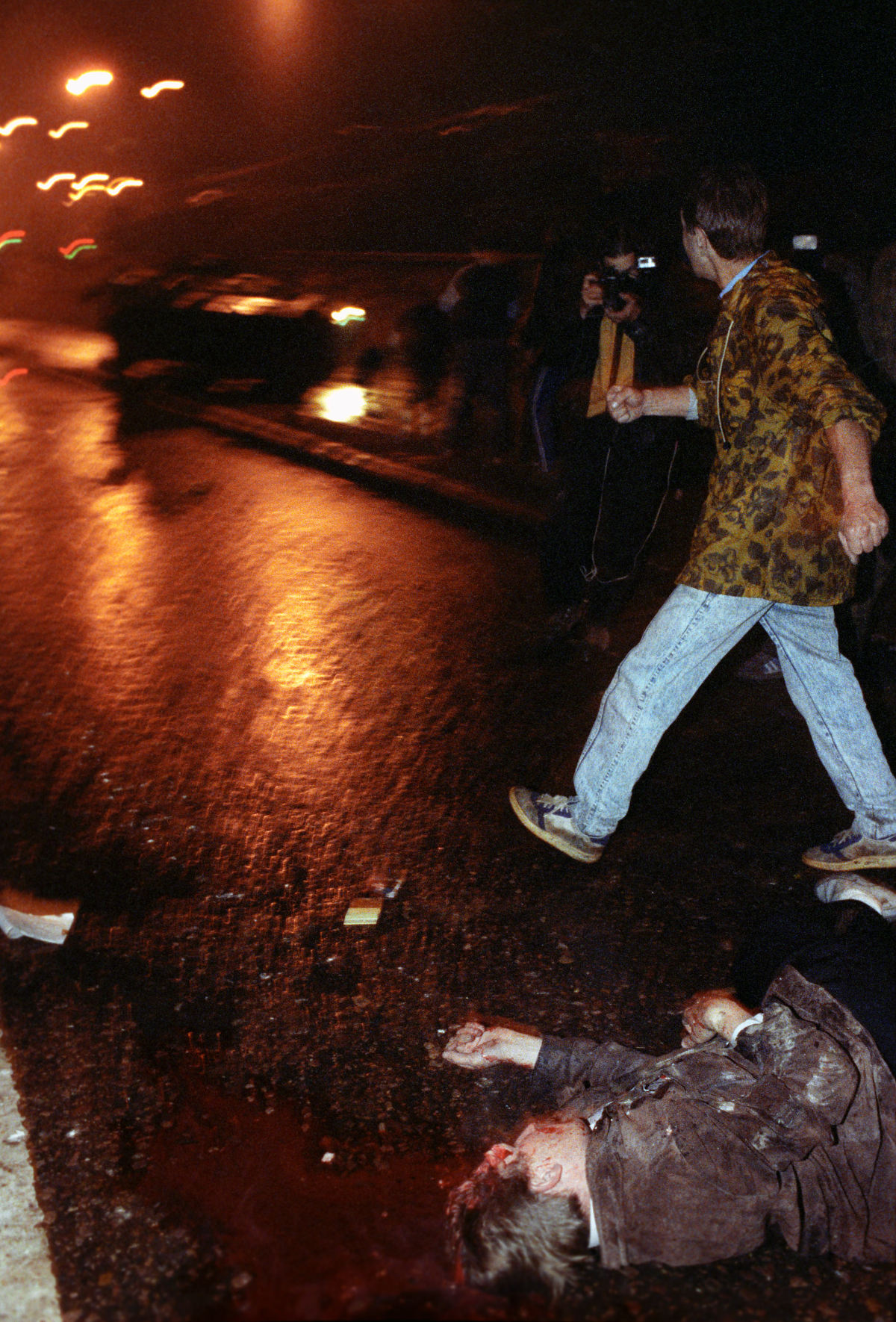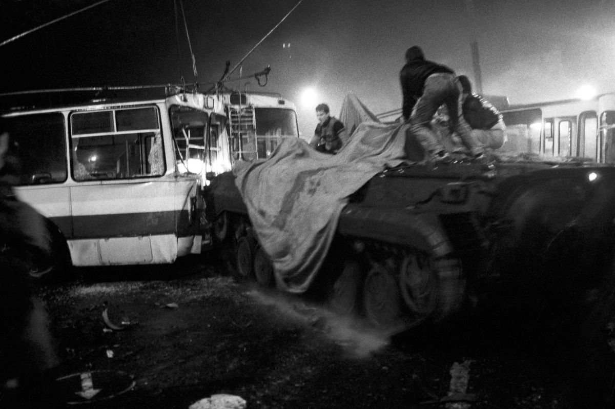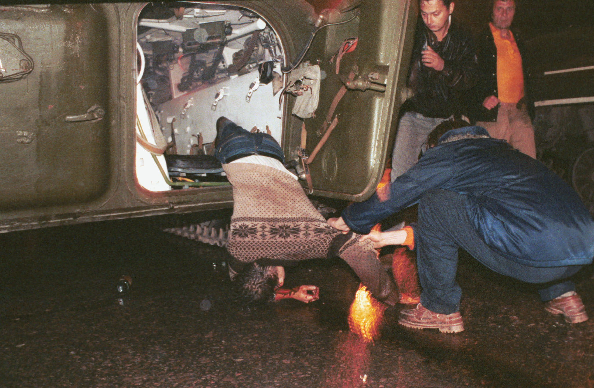 Первые шесть машин прорвались через баррикаду, седьмую машину (БМП № 536) толпа блокировала вновь, на броню вскочили молодые люди и набросили на приборы наблюдения брезент.