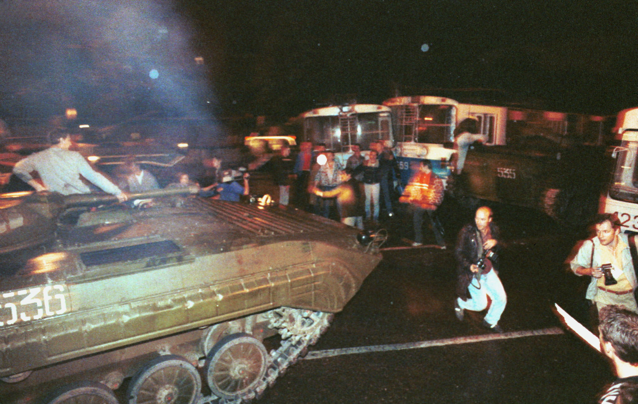 Ближе к полуночи 20 августа защитники Белого дома увидели, что колонна бронетранспортеров направляется к Белому дому: чтобы помешать продвижению БМП, они заблокировали проезд по Садовому кольцу с помощью сдвинутых троллейбусов.