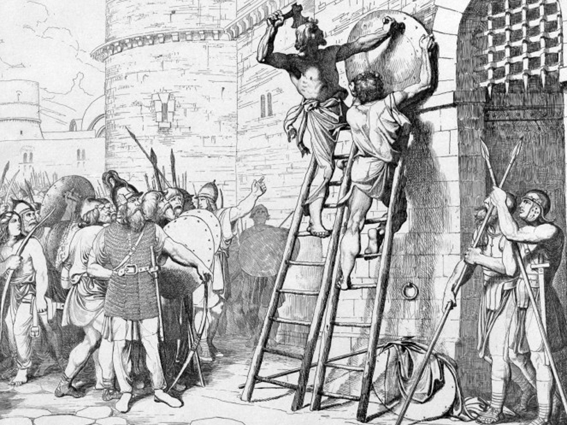 «Император [Карл III Толстый], подобно Ахаву, принял его [вождя викингов Готфрида] как друга и заключил с ним мир; от обеих сторон были выданы заложники. Норманны сочли это добрым предзнаменованием, и чтобы не было сомнений, что мир их незыблем, по своему обычаю высоко вывесили щит и отворили ворота крепости. Наши же, не зная об их коварстве, вошли в крепость, одни ради торговли, другие же осмотреть укрепления. Норманны же, вернувшись к своему обычному коварству, спустили щит мира, затворили ворота и всех наших, вошедших внутрь, либо убили, либо связали железными цепями для последующего выкупа» («Фульдские анналы»).