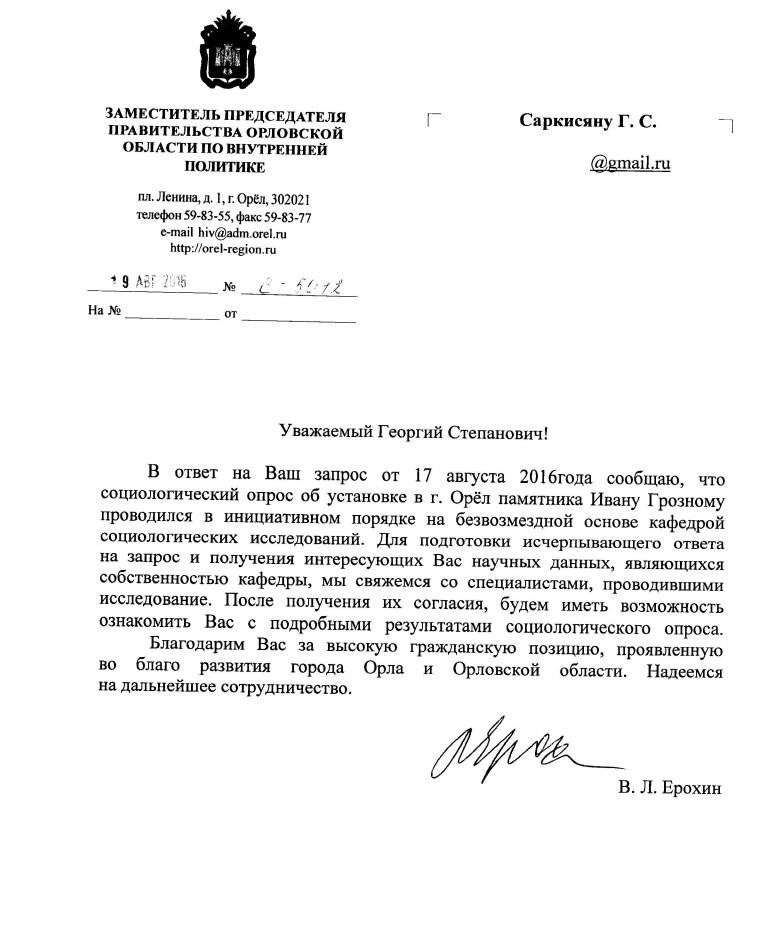 Социологический опрос мнений жителей Орла по поводу установки памятника Ивану Грозному проводили неизвестные социологи, власти региона не владеют информацией о том, какими методами «кафедра социологических исследований» опрашивала горожан, об этом рассказал в своем блоге орловский градозащитник Георгий Саркисян со ссылкой на официальный ответ заместителя губернатора региона Вячеслава Ерохина.