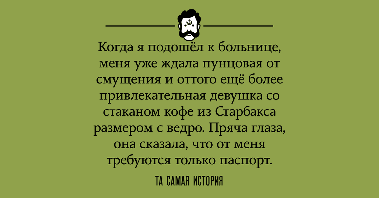 Когда я подошёл к больнице, меня уже ждала пунцовая от смущения и оттого ещё более привлекательная девушка со стаканом кофе из Старбакса размером с ведро. Пряча глаза, она сказала, что от меня требуются только паспорт и минут двадцать моего времени, всё остальное она сделает и скажет за меня сама. Мы прошли в регистратуру, моя роковая спутница сообщила суровой тётеньке в окошке с лицом, похожим на мятую подушку, к кому мы пришли, и та, внимательно изучив мой паспорт, заявила, что она сама проводит нас к палате, а то мы заблудимся. «Двоюродная сестра» стала вяло протестовать, но женщина уже вылезла из-за стойки и была настроена решительно. Мы пошли вперёд, а она шла следом за нами. Дойдя до нужной двери, я вдруг осознал, что так и не спросил у своей новой знакомой, как же зовут моего двоюродного брата, и так и замер, положив руку на ручку двери. Моя псевдородственница не растерялась и сказала медсестре, что та может идти, а мы хотим побыть с Димой (ага!) наедине, но я всё ещё чувствовал взгляд суровой тётеньки на своей спине, когда поворачивал ручку.