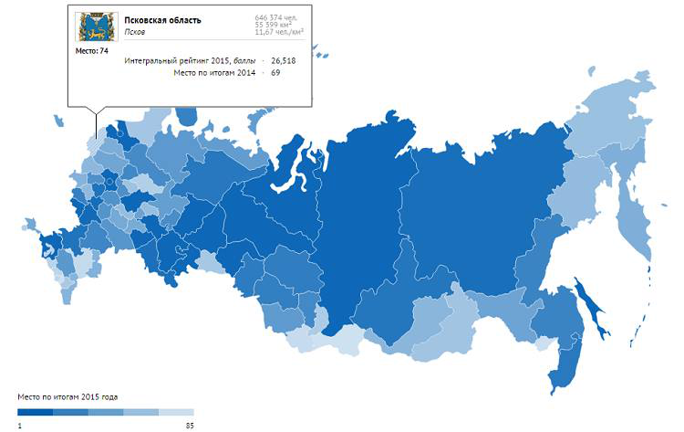 В 2015 году Псковская область заняла 74-е место в рейтинге социально-экономического развития регионов РФ