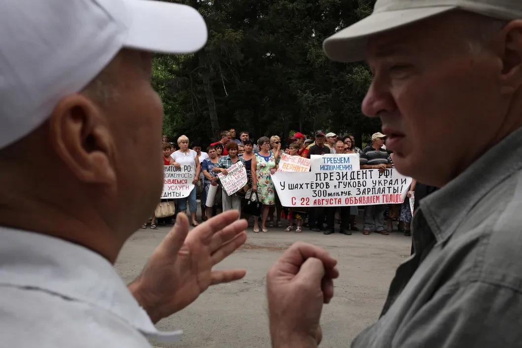 В среду, 24 августа, на пятачке перед зданием — двести человек. В первых рядах — женщины. Держат длинные плакаты: «Шахтер. Не верь, не бойся, не проси, а требуй своего», «Российский Донбасс против воров и жуликов», «Президент — гарант Конституции, губернатор — власть. Кто вернет шахтерам 300 млн рублей за работу в аду». И главный: «Верните наши деньги, мы сами решим, как жить».