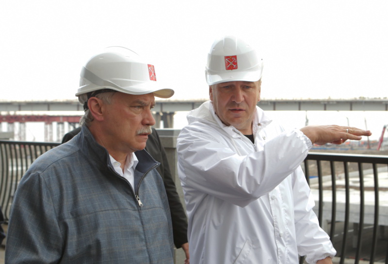 Губернатор Георгий Полтавченко и вице-губернатор Игорь Албин на стройплощадке стадиона. 22 июня 2016. Фото: spb.gov.ruКроме того, пояснила пресс-служба, Полтавченко поручил руководителю городского комитета по строительству Сергею Морозову «провести разъяснительную работу со средствами массовой информации по поводу финансирования завершения строительства футбольного стадиона». Однако откуда город возьмет свыше 7 миллионов рублей, если не будут затронуты расходы на социальные объекты, до сих пор неясно.