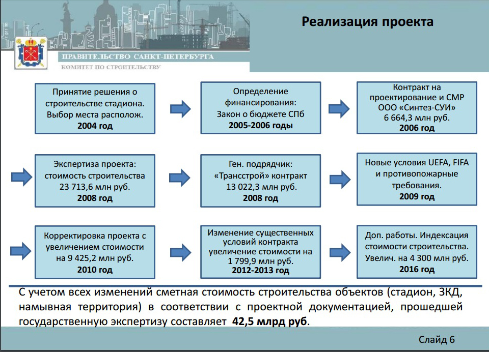 Стадион для футбольного клуба «Зенит» на Крестовском острове, на месте стадиона имени Кирова, начали строить еще в 2007 году. Предполагалось, что он будет рассчитан на 68 тысяч зрителей, а его общая площадь составит около 280 тыс. кв.м. Однако строительство продвигалось медленно: сроки сдачи объекта не раз переносились, а стройка год от года дорожала.