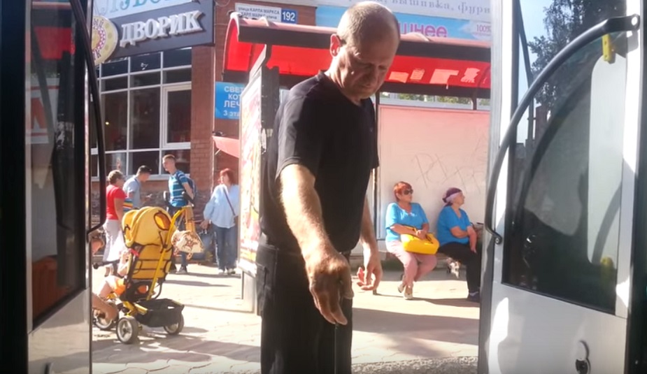 Общественник попросил водителя помочь ему выйти на остановке у торгового центра «Северный Рай». Автобус остановился далеко от бордюра. Водитель перепарковался и помог Костину покинуть салон.